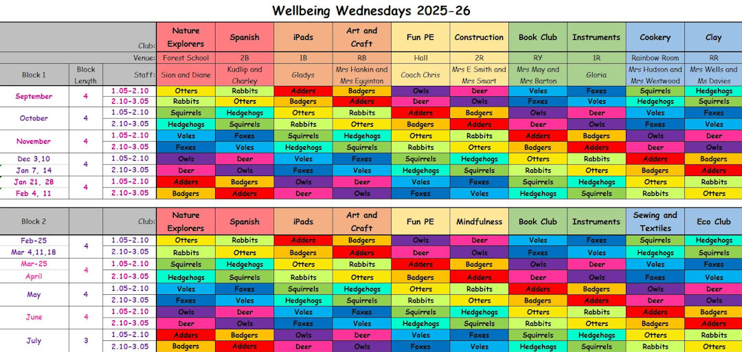 The timetable shows which two clubs each child’s group will be doing each week. Children should know which animal group they are in, but if families are unsure, the office can let you know.