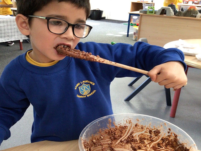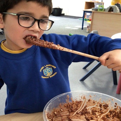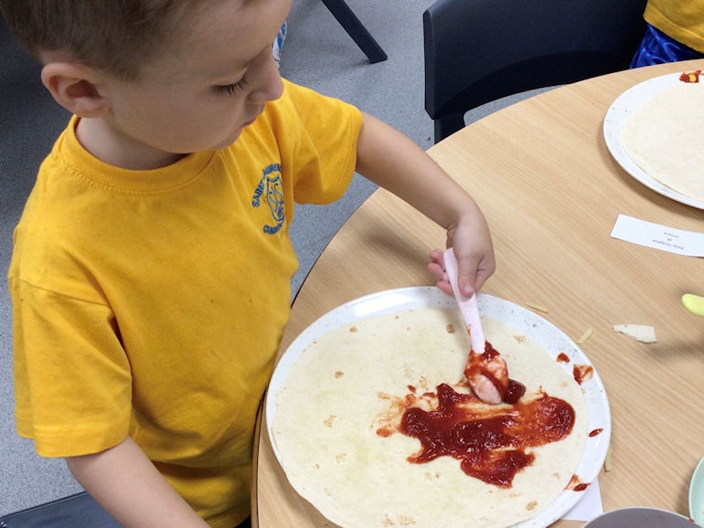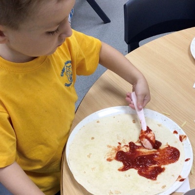 Cookery – – led by Mrs Hudson and Mrs Westwood. Children practice cookery skills such as chopping, peeling, mixing, melting, sprinkling. They make a simple food product each week which they bring home one to try and one to share. Recently they have made things such as decorated biscuits, pizza pockets and apple ‘doughnuts’. The children can also enjoy playing with the role play and small world toys, including the pretend play house in the Rainbow Room.