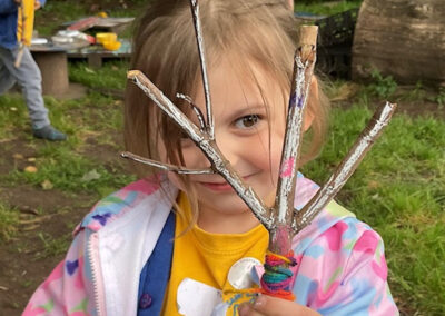 Forest School – led by Sian and Diane, who are level 3 forest school trained providers from Forest Families. The children are shown practical natural activities including seasonal natural crafts such as flower stamping and twig wrapping; and closely supervised outdoor skills such as whittling (with carrots), sawing ‘leaf cookies’, fire-lighting with flints. They can choose to have a go at the activities or to explore the area and climb, swing, make mud pies or look for minibeasts etc.